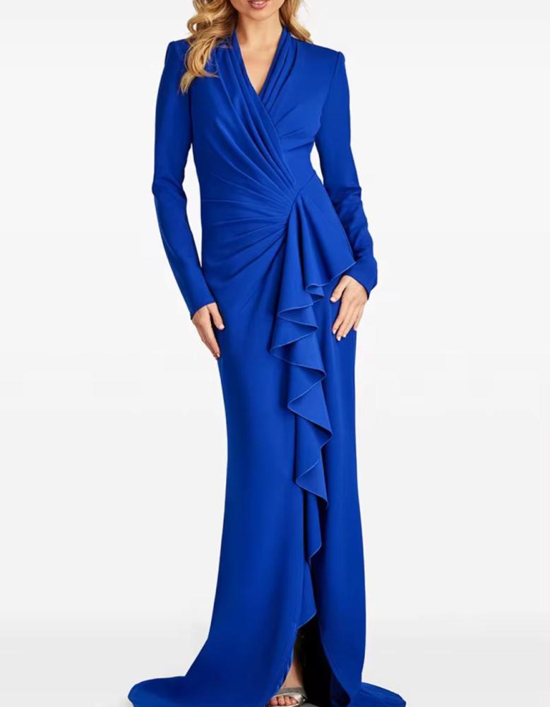 فستان لون ازرق غامق بتصميم أنيق بأكمام طويلة وقصة لف عند الخصر، مزود بكرانيش طولية تضفي لمسة فاخرة وكلاسيكية تناسب الحفلات الرسمية والمناسبات الفخمة بكل تميز.